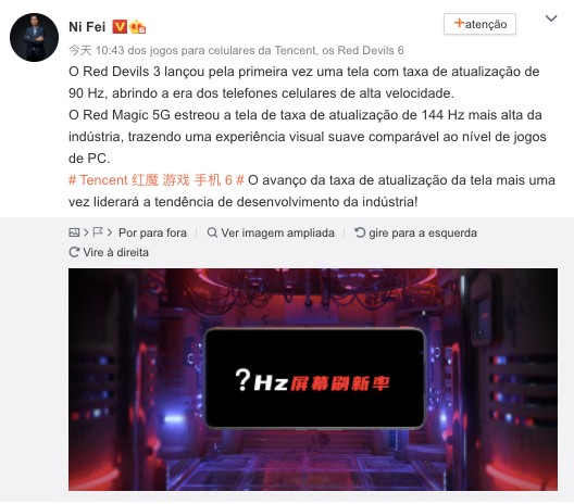 O universo dos smartphones voltados para o público gamer envolve taxas de atualização que já deixaram os 60 Hz na pré-história. Agora, às vésperas do lançamento do novo Red Magic 6, da fabricante chinesa Nubia, seu presidente Ni Fei acaba de divulgar um teaser sobre a taxa de atualização do novo aparelho: embora não tenha revelado o valor, adiantou que é maior do que 144 Hz, o que aponta para impressionantes 160 Hz.